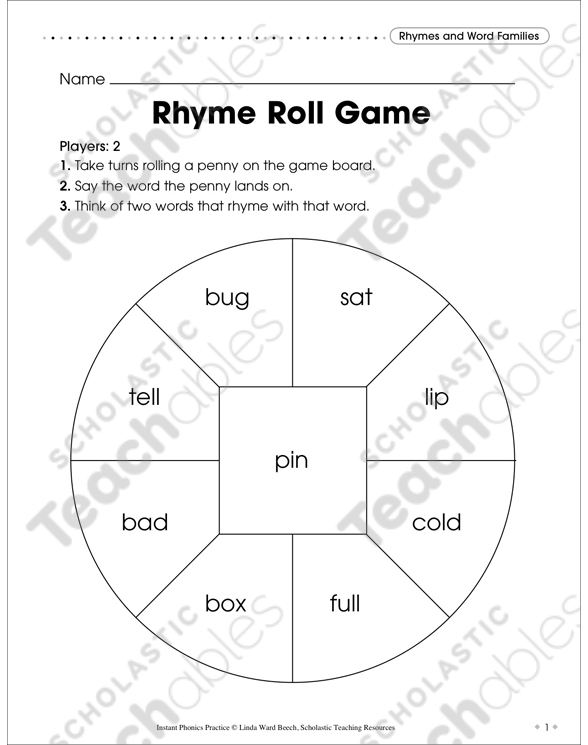 Rhymes And Word Families Rhyme Roll Game Printable Skills Sheets Game Boards